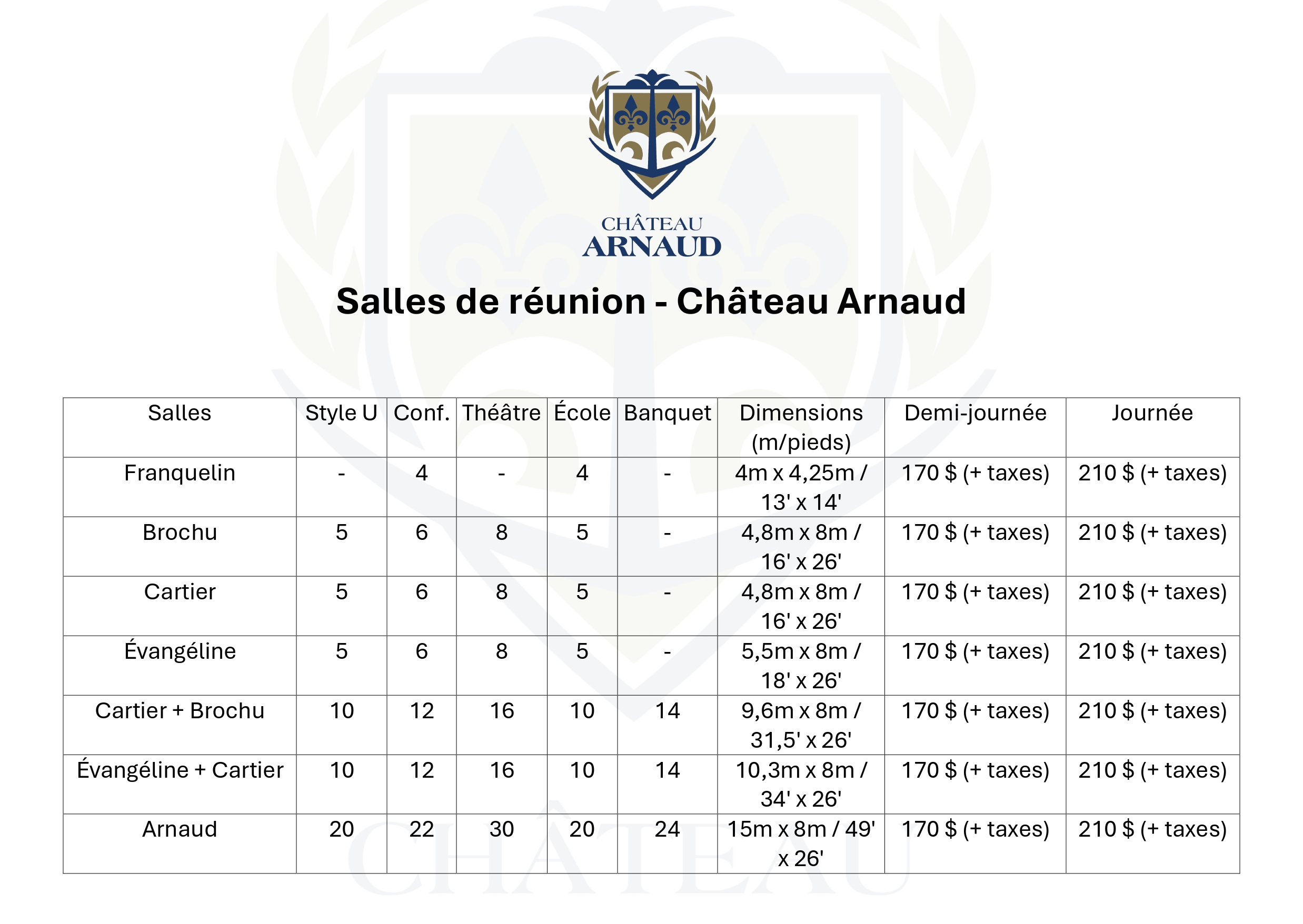 Le Château Arnaud est l’endroit tout désigné pour faire de votre réunion ou de votre événement un moment inoubliable. Notre équipe dévouée a mis en place les mesures nécessaires afin de vous recevoir, vous et vos invités, dans un environnement des plus sécuritaire. Nous vous invitons à nous contacter pour vous accompagner dans l’organisation de votre réunion ou événement.
